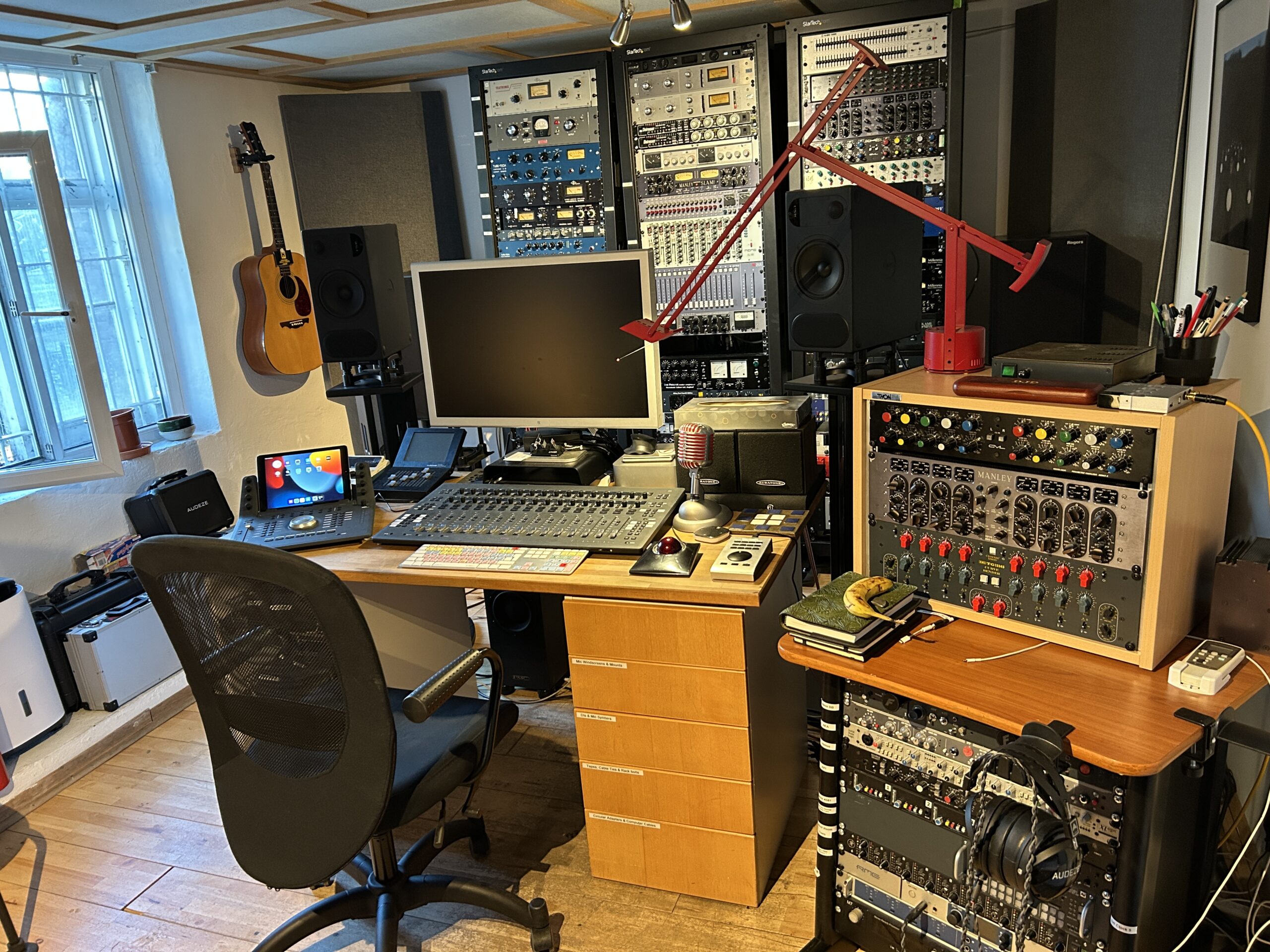 Greg works out of his studio next to Regent’s Canal. The well-equipped studio offers a restored 1914 Broadwood Grand Piano and a comprehensive collection of vintage and modern microphones and recording equipment. Click here for a complete list.